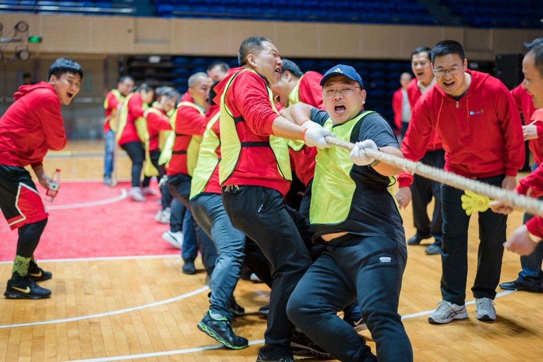 下午2點,奧體中心多功能體育館,管理聯(lián)隊、財務(wù)票務(wù)隊、分銷一隊、分銷二隊、物流中心隊、快樂人壽天隊,六支員工團隊群情振奮,士氣高亢,口號震天。比賽設(shè)置了拔河比賽、定點投籃、羽毛球發(fā)球、巨人腳步、協(xié)力闖關(guān)五個趣味運動項目。每隊均派出了精兵強將,征戰(zhàn)賽場。